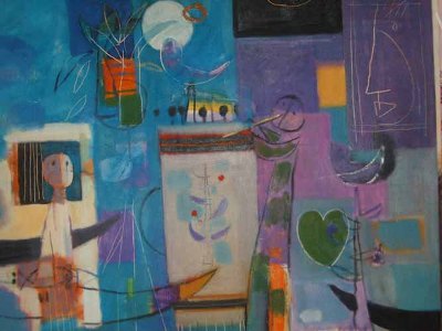 إن التنغيم اللوني الذي يحاول الفنان فرشه على سطح اللوحة يتناغم مع حركة بعض الخطوط الزخرفية هنا وهناك ، فهي فضلاً عن بنيتها التجريدية ، فهي تضيف للمحمول أبعادا قرائية ووجدانية ، تنسجم مع محاولاته تأسيس خطابا منفتحا/منتفخاً ، وهي تنسجم مع استخداماته للون وتكراراته للأشكال وتلقائيته وسعي للتسطيح والشفافية والجمع بين الأزمنة والأمكنة .